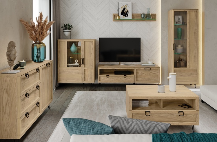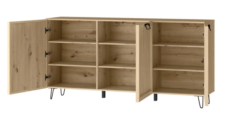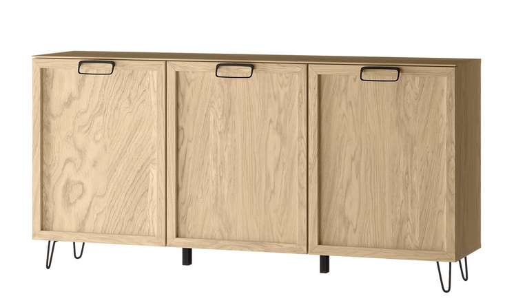 Komoda třídveřová v nadčasovém provedení. Korpus je vyroben z přírodní dýhy v barvě dub artisan, dvířka jsou vyrobeny z masivu v provedení dub artisan olejovaný. Úchyty a nožky jsou kovové v barvě černá mat. Dvířka disponují systémem tichého dovírání. Dodáváme již ve smontovaném stavu.CASA 75099