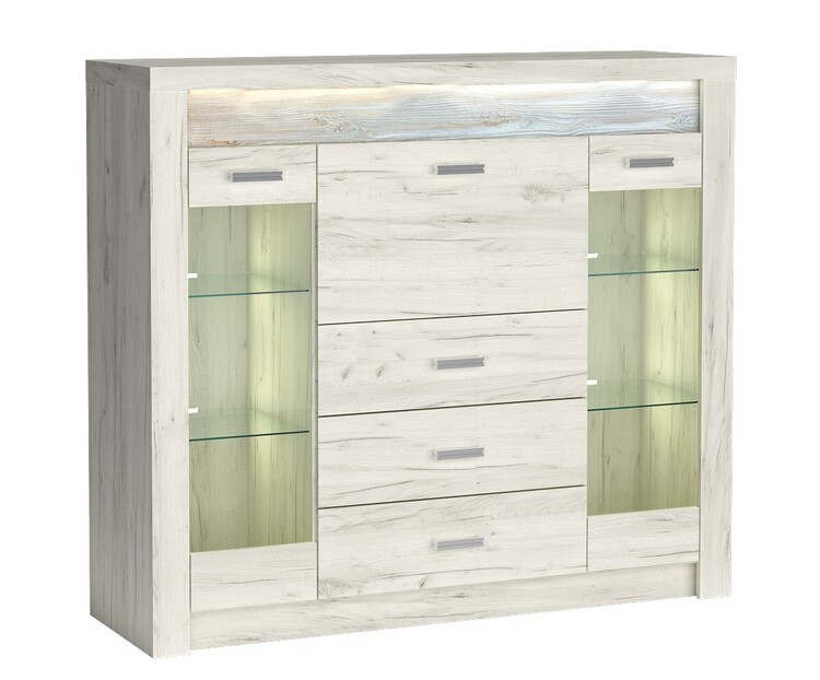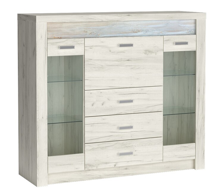 Komoda – bar ze sektorové řady. Komoda obsahuje 2 vitríny, 3 zásuvky a výklopná dvířka. Systém je exkluzivní kolekce navržena v moderním duchu. Vsazením LED osvětlení do ozdobné rýhované lišty, které najdete v naší další nabídce k dokoupení, je zvýrazněn rustikální vzhled masivního dřeva. Celá řada se vyznačuje elegancí a jednoduchými tvary, které zaručují plné využití prostoru. Nábytek je vyroben z kvalitního lamina s ABS hrany ( 0,5–0,8 mm ). Barevné provedení jasan bílý. Dodáváme v demontovaném stavu.CASA 71007