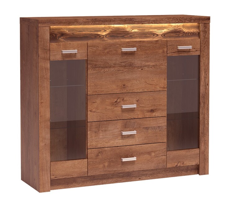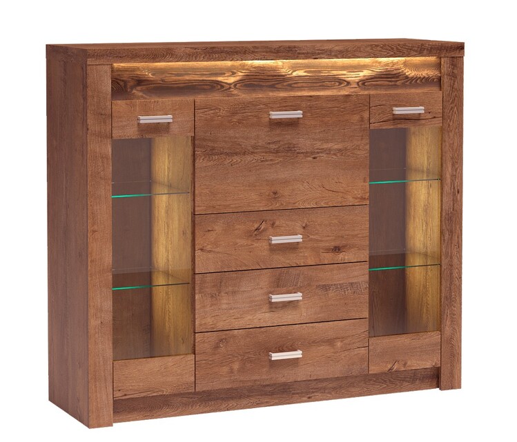 Komoda – bar ze sektorové řady. Komoda obsahuje 2 vitríny, 3 zásuvky a výklopná dvířka. Systém je exkluzivní kolekce navržena v moderním duchu. Vsazením LED osvětlení do ozdobné rýhované lišty, které najdete v naší další nabídce k dokoupení, je zvýrazněn rustikální vzhled masivního dřeva. Celá... více informací o zboží