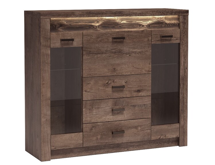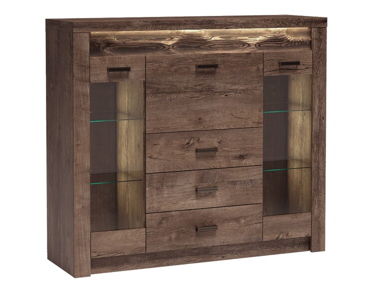 Komoda – bar. Komoda obsahuje 2 vitríny, 3 zásuvky a výklopná dvířka. Systém je exkluzivní kolekce navržena v moderním duchu. Vsazením LED osvětlení do ozdobné rýhované lišty, které najdete v naší další nabídce k dokoupení, je zvýrazněn rustikální vzhled masivního dřeva. Možnost dokoupení LED... více informací o zboží