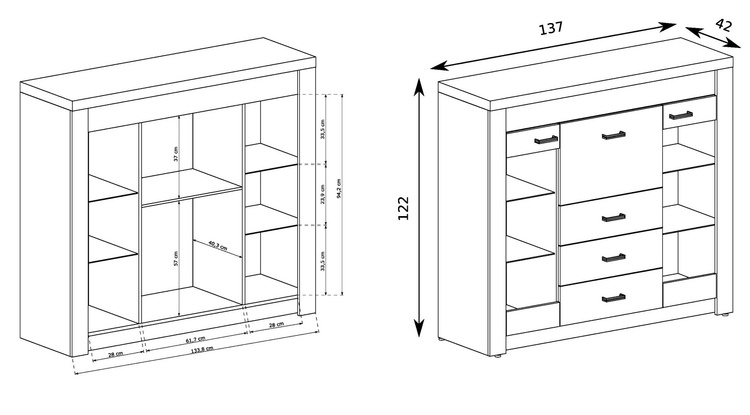 Komoda – bar. Komoda obsahuje 2 vitríny, 3 zásuvky a výklopná dvířka. Systém je exkluzivní kolekce navržena v moderním duchu. Vsazením LED osvětlení do ozdobné rýhované lišty, které najdete v naší další nabídce k dokoupení, je zvýrazněn rustikální vzhled masivního dřeva. Možnost dokoupení LED bodového osvětlení i u skleněných polic. Celá řada se vyznačuje elegancí a jednoduchými tvary, které zaručují plné využití prostoru. Nábytek je vyroben z kvalitního lamina s ABS hrany ( 0,5–0,8 mm ). Barevné provedení jasan tmavý. Dodáváme v demontovaném stavu.CASA 71007