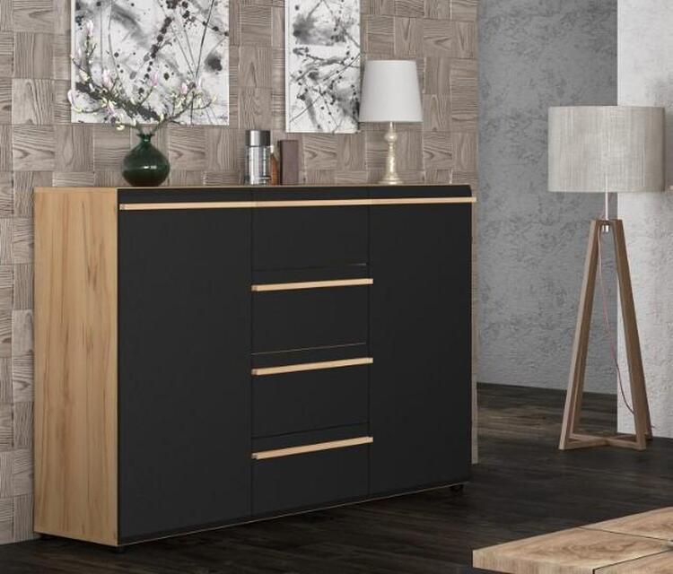 Komoda dvoudveřová se 4 zásuvkami, korpus je vyroben z kvalitní LTD v barvě buk, dvířka a čela zásuvek jsou vyrobeny z desky MDF v barevném provedení černá textura. Úchyty jsou z přírodního bukového dřeva. Dodáváme v demontovaném stavu.CASA 97045