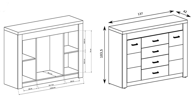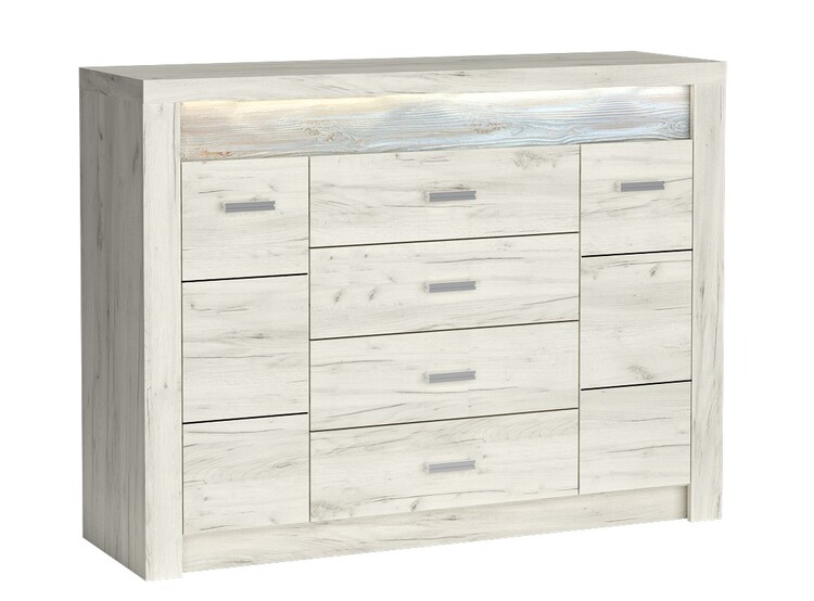 Komoda ze sektorové řady. Komoda obsahuje 4 zásuvky, za dvířky jsou 2 police. Systém je exkluzivní kolekce navržena v moderním duchu. Vsazením LED osvětlení do ozdobné rýhované lišty, které najdete v naší další nabídce k dokoupení, je zvýrazněn rustikální vzhled masivního dřeva. Celá řada se vyznačuje elegancí a jednoduchými tvary, které zaručují plné využití prostoru. Nábytek je vyroben z kvalitního lamina s ABS hrany ( 0,5–0,8 mm ). Barevné provedení jasan bílý. Dodáváme v demontovaném stavu.CASA 71007