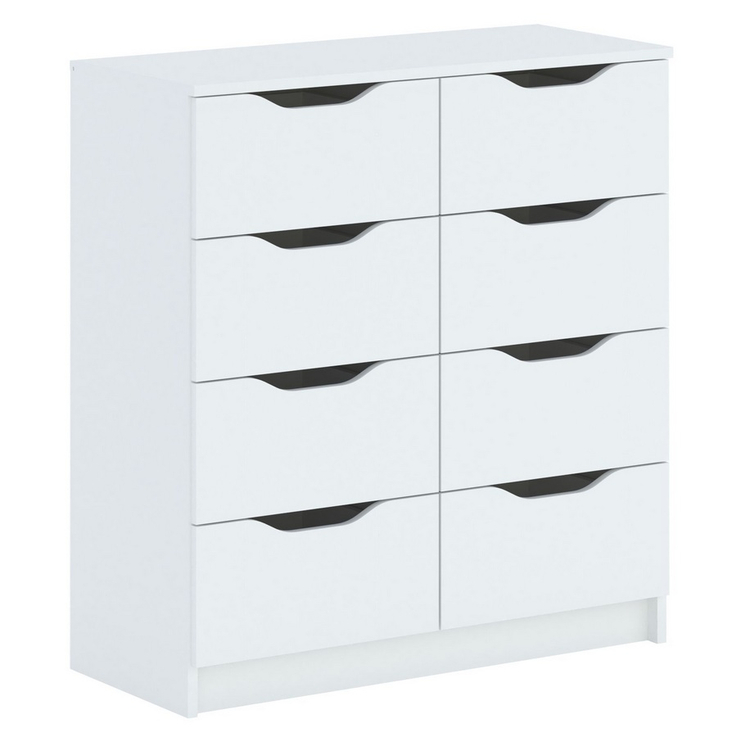 Komoda s 8 zásuvkami v moderním provedení. Korpus i dvířka jsou z kvalitní LTD hraněné ABS páskou (0,45 mm) v barvě matná bílá. Lamino je odolné vůči vysokým teplotám a poškrábání. Dodáváme v demontovaném stavu.CASA 85012