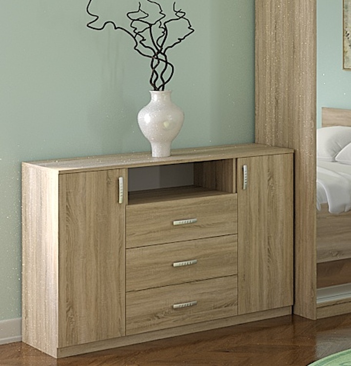 Komoda dvoudveřová se třemi zásuvkami a regálkem je vyrobena z LTD desky odolné vůči poškrábání v barvě dub sonoma. Dodáváme v demontovaném stavu.CASA 19011