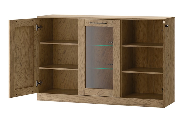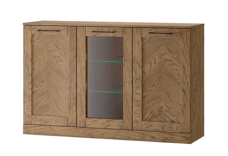 Komoda třídveřová v nadčasovém provedení. Korpus je vyroben z přírodní dýhy v barvě dub rustikální, dvířka jsou vyrobeny z masivu v kombinaci s přírodní dýhou v zajímavém dekoru rybí kost v provedení dub rustikální olejovaný. Součástí komody je také LED osvětlení prosklené části. Úchyty jsou kovové v barvě černá mat. Dvířka disponují systémem tichého dovírání. Dodáváme již ve smontovaném stavu.CASA 75098