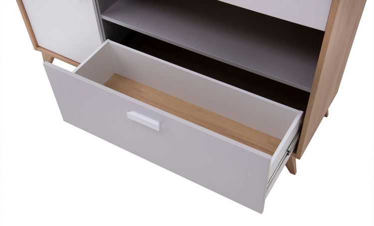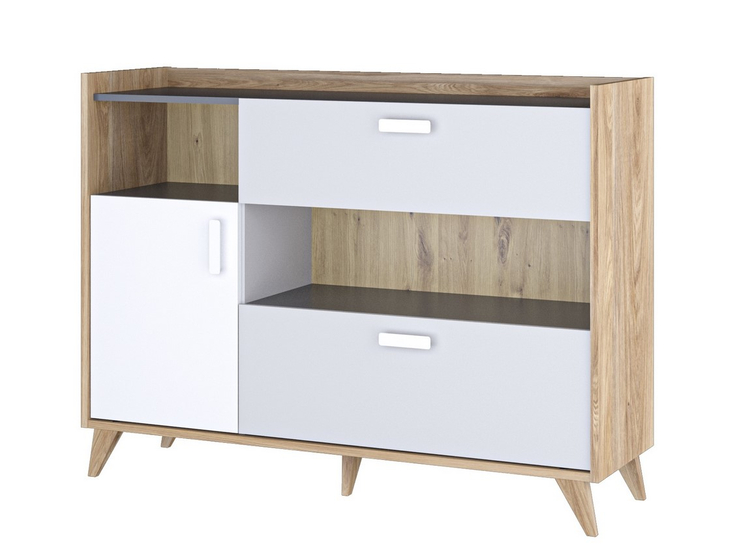 Komoda jednodveřová se dvěma zásuvkami v moderním stylu a geometrických tvarech. Nábytek je vyroben z desky LTD hraněné páskou ABS, korpus je v barvě dub castello medový, dvířka jsou v barvě bílá alpská, zásuvky jsou v šedé barvě. Zatížení polic max. 5 kg. Nožky mají netradiční zkosený tvar.... více informací o zboží