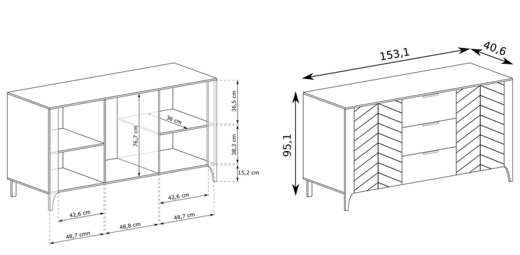 Komodu podepírají štíhlé nožky MDF o výšce 15 cm, které