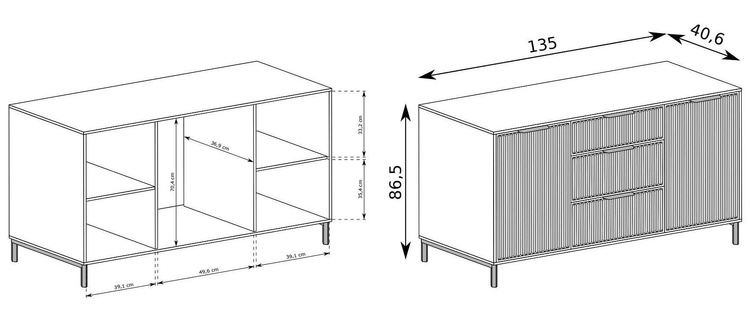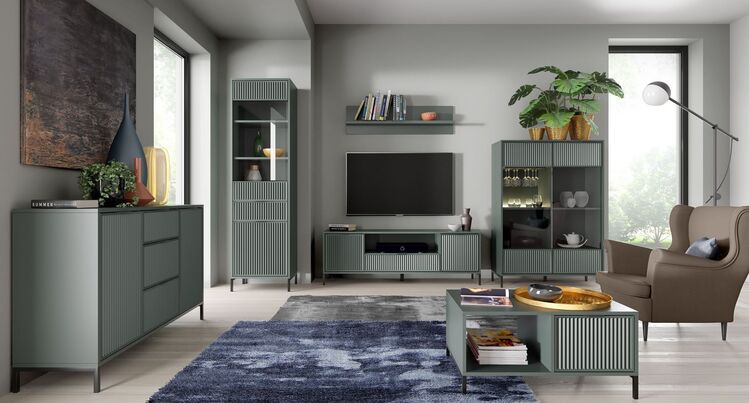 Nábytek je zdoben vzorem na čelních stranách v podobě frézovaných drážek. Všechny kusy nábytku z této kolekce stojí na černých kovových nožkách. Jednoduché a funkční tvary se hodí do obývacího pokoje, ložnice i jídelny.