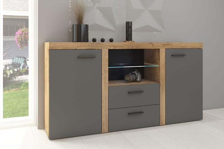 Komoda v moderním provedení. Korpus je vyroben z kvalitního lamina v barvě dub lefkas, dvířka jsou vyrobena v barvě grafit. Úchyty jsou plastové černé. Dodáváme v demontovaném stavu.CASA 87008