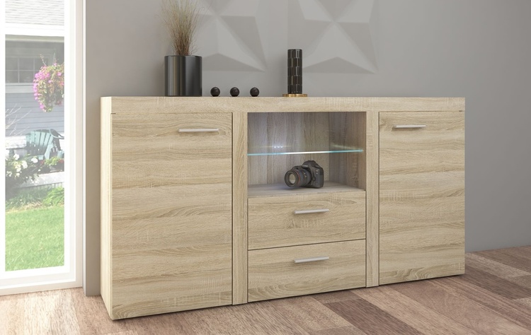 Komoda v moderním provedení. Korpus i dvířka jsou vyrobeny z kvalitního lamina v barvě dub sonoma. Úchyty jsou plastové černé. Dodáváme v demontovaném stavu.CASA 87008