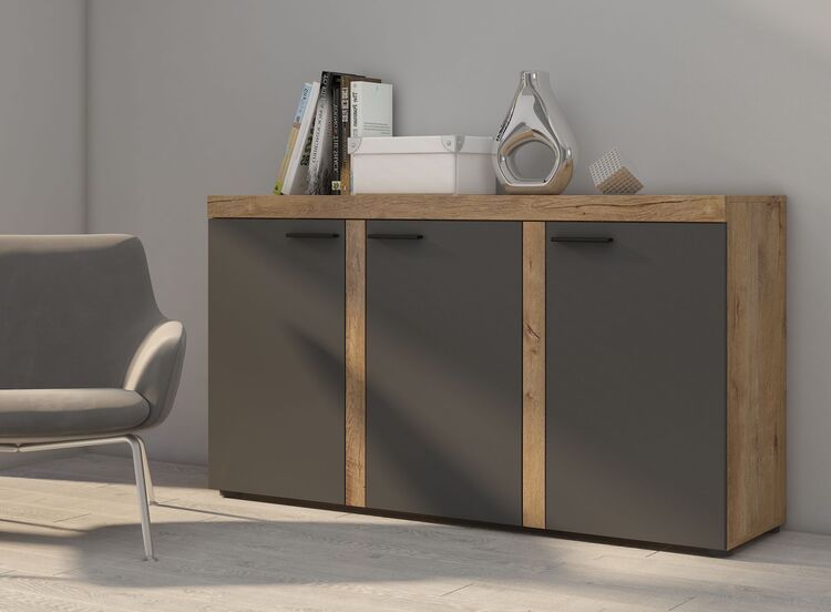 Komoda třfídveřová v moderním provedení. Korpus je vyroben z kvalitního lamina v barvě dub lefkas, dvířka jsou vyrobena v barvě grafit. Úchyty jsou plastové černé. Dodáváme v demontovaném stavu.CASA 87008