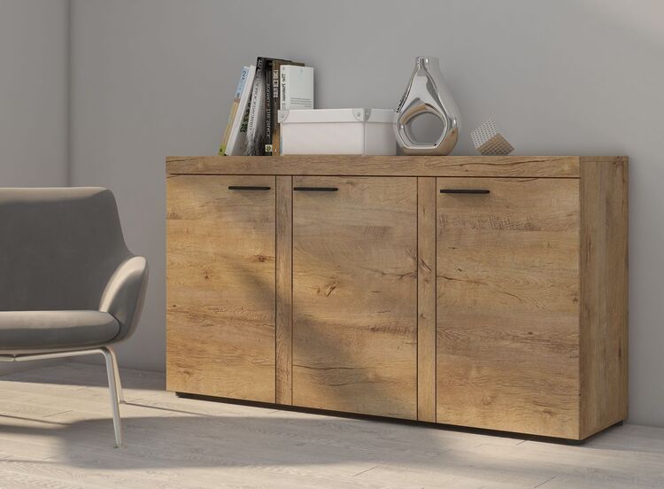Komoda třfídveřová v moderním provedení. Korpus i dvířka jsou vyrobeny z kvalitního lamina v barvě dub lefkas. Úchyty jsou plastové černé. Dodáváme v demontovaném stavu.CASA 87008