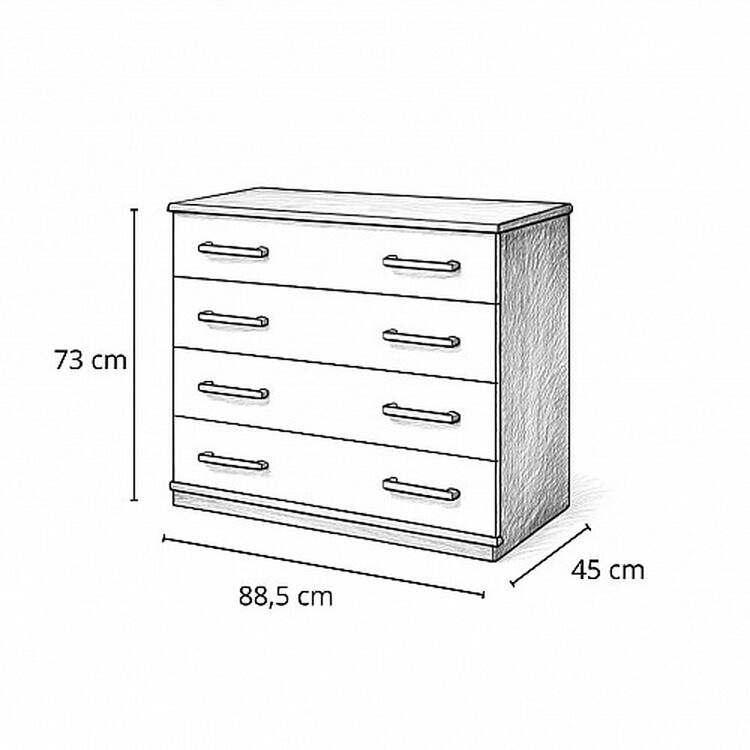 Komoda ROMA je praktický kus nábytku, který nabízí dostatek úložnéhoprostoru díky čtyřem prostorným podlouhlým zásuvkám. Ty jsou ideálnípro uložení drobností, oblečení nebo jiných věcí, které chcete mítvždy po ruce. Komoda má rozměry 88,5 cm na šířku, 73 cm na výšku a45 cm na hloubku, což ji činí vhodnou pro většinu místností.