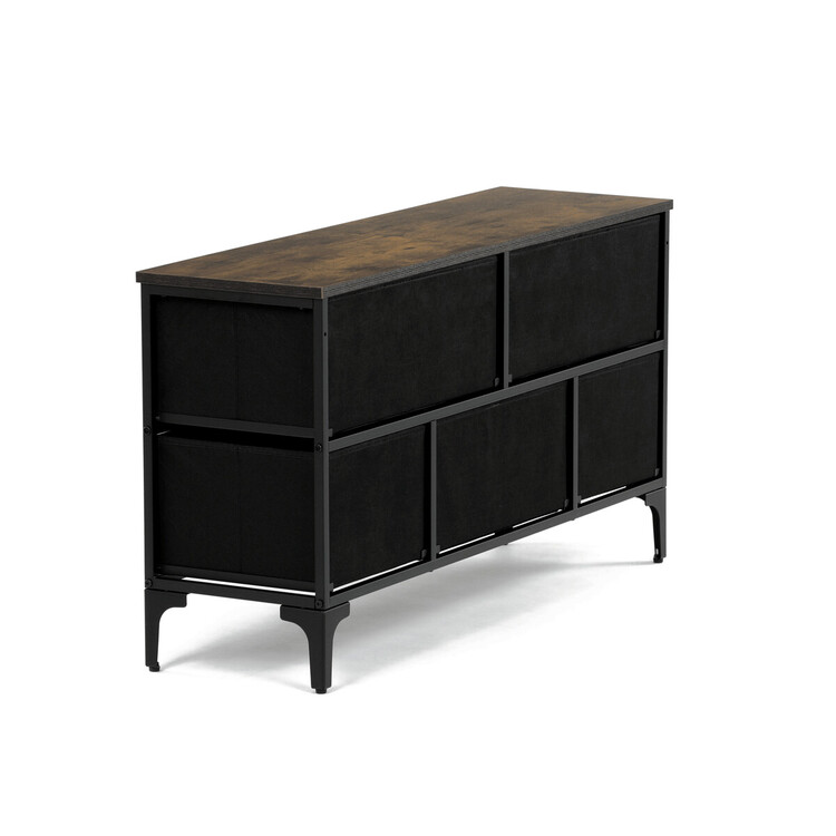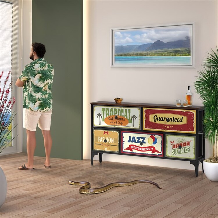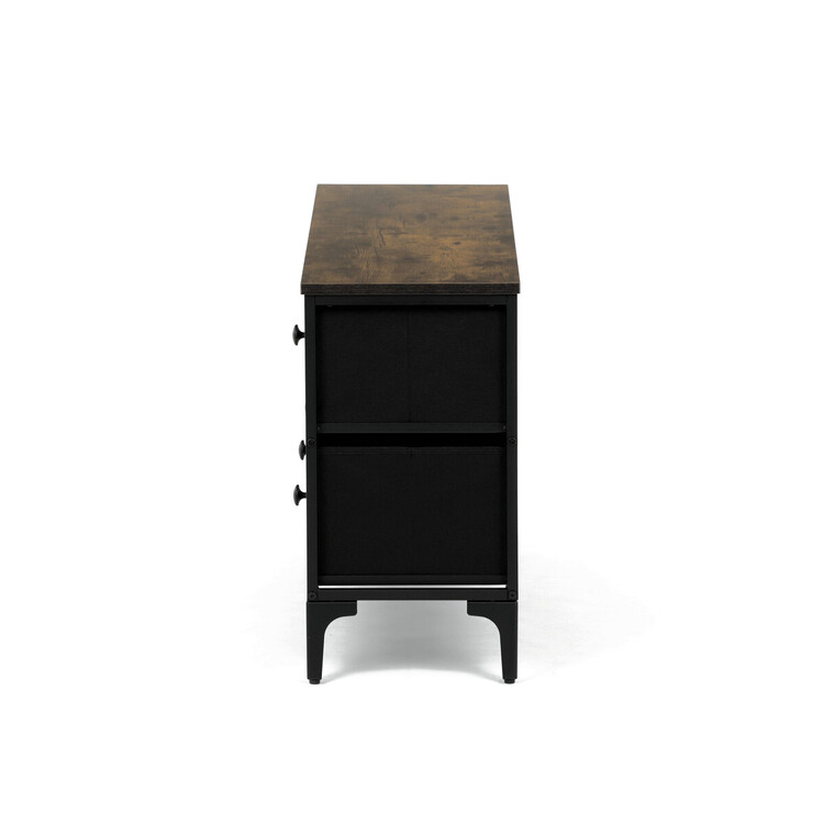 Retro komoda značky Autronic přinese do vašeho interiéru jedinečný styl a originalitu. Textilní čela zásuvek s výplní HDF a vintage potiskem navozují atmosféru starých amerických barů a jazzových klubů. Kombinace černé kovové konstrukce, desky v dekoru starého dřeva a zdobných noh dodává nábytku robustní, ale zároveň elegantní vzhled. Korpus zásuvek je vyroben z netkané textilie s výplní MDF, což zajišťuje jejich lehkost a snadnou manipulaci. Ideální doplněk do obývacího pokoje nebo stylové kavárny, kde se stane nepřehlédnutelným prvkem.