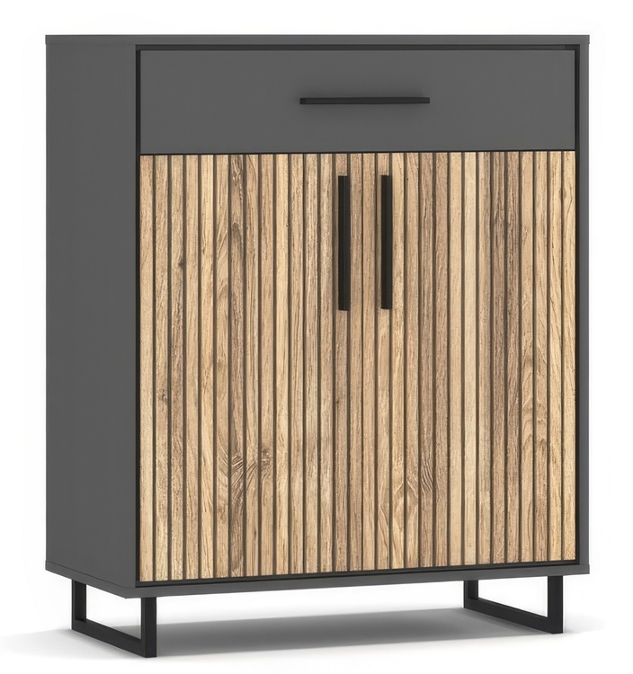Komoda dvoudveřová se zásuvkou v industriálním stylu je vyrobena z LTD desky, korpus je v barvě šedé, přední část dvířek je doplněna lištami z přírodního dubového dřeva. Nohy jsou kovové černé. Nábytek disponuje teleskopickými pojezdy a systémem samodovíracích závěsů. Nabídka komponentů této... více informací o zboží