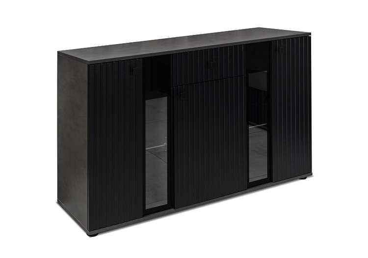 Komoda v moderním stylu. Komoda je částečně prosklená, má 3 dvířka a 1 praktickou zásuvku. Barevné provedení černá/matera. Tato komoda krásně doplní obývací stěnu, kterou rovněž najdete v naší nabídce. Nábytek je vyroben z kvalitního lamina. Přední část komody je vyrobena z kvalitní MDF desky... více informací o zboží
