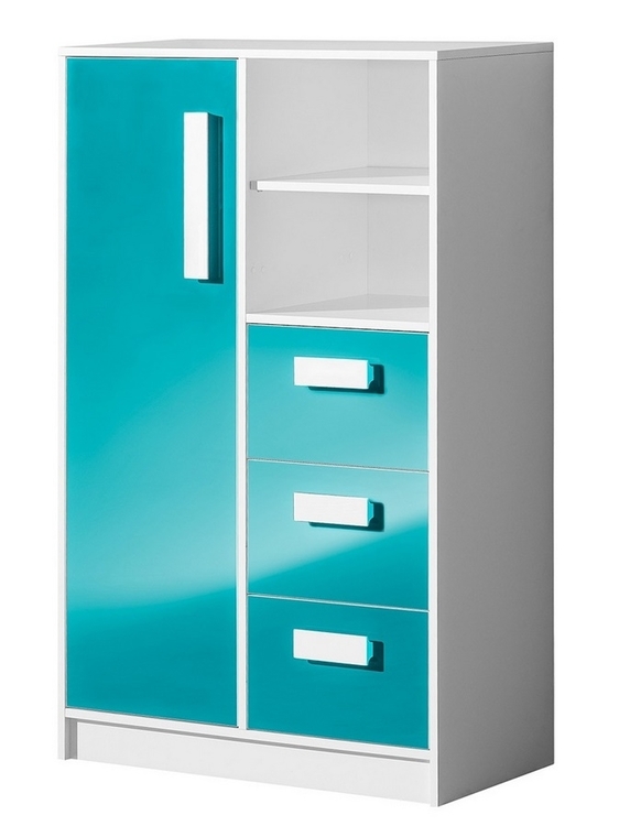 Kombinovaná komoda se třemi zásuvkami a policemi ze sektorové řady GULLIWER, která se vyznačuje netradičním zpracováním barev a originalitou úchytů. Tento styl nábytku zaujme každou mladší generaci. Komoda je vyrobena z kvalitní LTD desky hraněné ABS lištou. Korpus je v barvě bílá mat, dveře jsou barvě tyrkysová lesk. Úchytky jsou v barvě bílé. Sektorový nábytek GULLIWER má široký výběr prvků, který Vám zaručí sestavit si dětský nebo studentský pokoj, ložnici či kancelář podle svých potřeb, přání a představ. Dodáváme v demontovaném stavu.CASA 23002