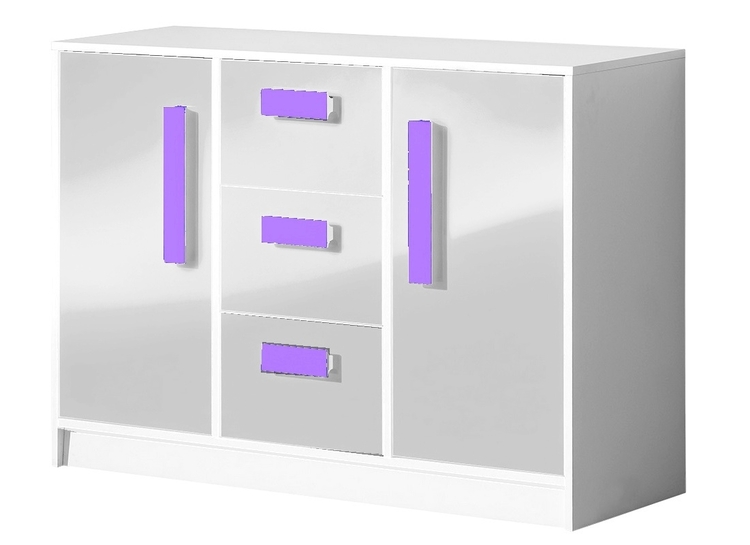Široká komoda se třemi zásuvkami ve střední části ze sektorové řady GULLIWER, která se vyznačuje netradičním zpracováním barev a originalitou úchytů. Tento styl nábytku zaujme každou mladší generaci. Komoda je vyrobena z kvalitní LTD desky hraněné ABS lištou. Korpus je v barvě bílá mat, dveře jsou barvě bílá lesk. Úchytky jsou v barvě fialové. Sektorový nábytek GULLIWER má široký výběr prvků, který Vám zaručí sestavit si dětský nebo studentský pokoj, ložnici či kancelář podle svých potřeb, přání a představ. Dodáváme v demontovaném stavu.CASA 23002