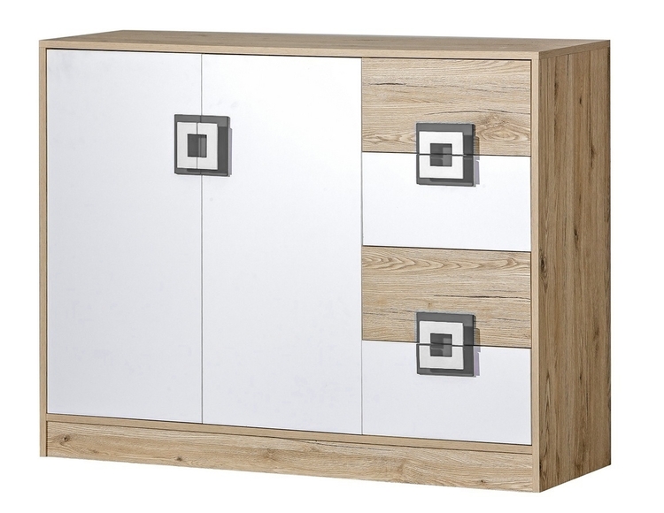 Komoda široká NIKO ze sektorové řady, která se vyznačuje netradičním zpracováním barev a originalitou úchytů. Tento styl nábytku zaujme každou mladší generaci. Komoda je vyrobena z kvalitní LTD desky hraněné ABS lištou. Korpus je v barvě dub jasný, dveře jsou v kombinaci barev bílá mat / dub jasný. Úchytky jsou v barevné kombinaci popel / bílá. Uvnitř komody je police a 4 zásuvky v pravé části. Sektorový nábytek NIKO má široký výběr prvků, který Vám zaručí sestavit si dětský nebo studentský pokoj, ložnici či kancelář podle svých potřeb, přání a představ. Dodáváme v demontovaném stavu.CASA 23004
