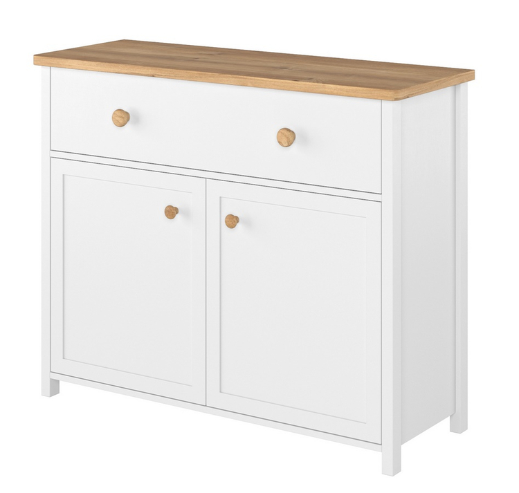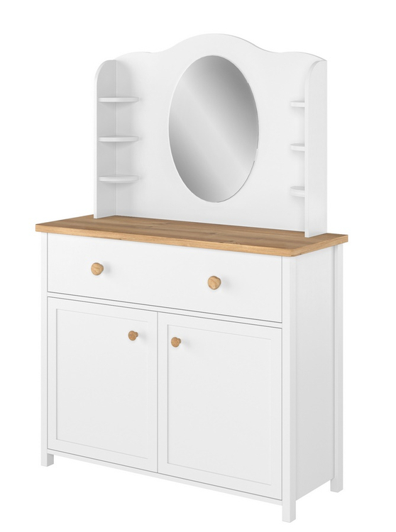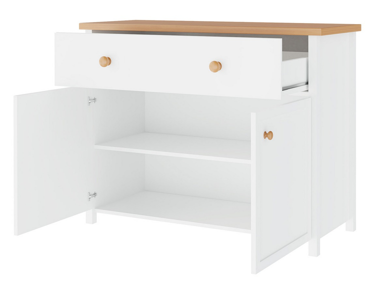 Dvoudveřová komoda se zásuvkou. Tento elegantní nábytek dodá romantickou atmosféru pokojíčku malé princezny i větší slečny. Komoda je vyrobena z desky LTDv kombinaci s MDF v barvě bílé s doplňkovou barvou dub Nash ( 22 mm ). Komoda má v horní části zásuvku a pod ní jsou dvoje dvířka. Úchyty jsou plastové v barvě dub nash. Dodáváme v demontovaném stavu.CASA 73015