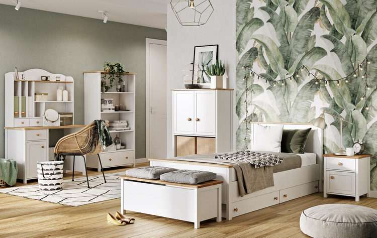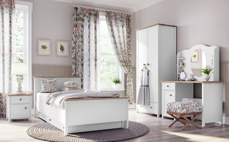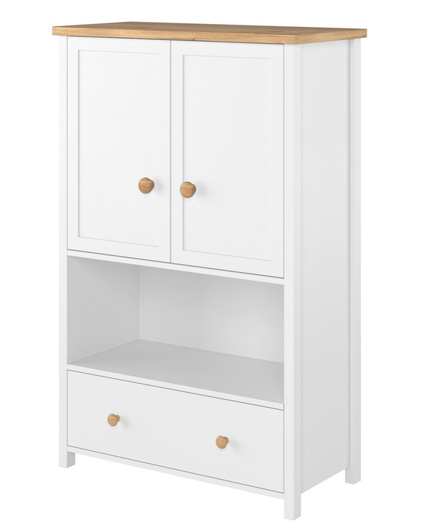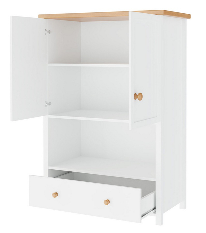 Dvoudveřová komoda se zásuvkou. Tento elegantní nábytek dodá romantickou atmosféru pokojíčku malé princezny i větší slečny. Komoda je vyrobena z desky LTD v kombinaci s MDF v barvě bílé s doplňkovou barvou dub Nash ( 22 mm ). Komoda má v horní části dvířka a ve spodní části zásuvku. Úchyty jsou plastové v barvě dub nash. Dodáváme v demontovaném stavu.CASA 73015