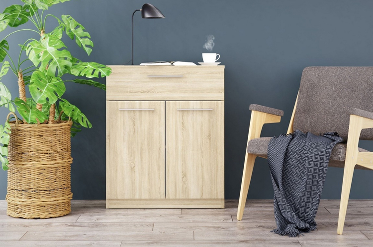 Dvoudveřová komoda se zásuvkou v moderním provedení. Korpus i dvířka jsou z kvalitní LTD (18 mm) v barvě dub sonoma. Lamino je odolné vůči vysokým teplotám a poškrábání. Dodáváme v demontovaném stavu.CASA 85011