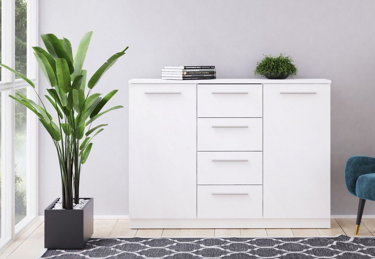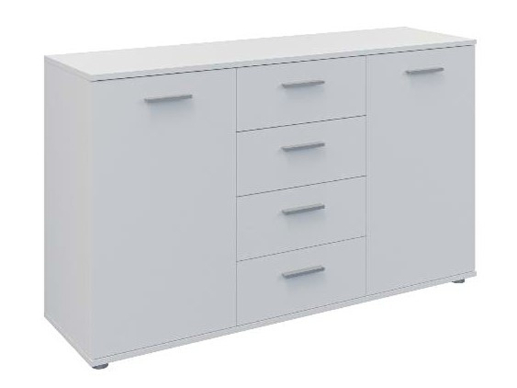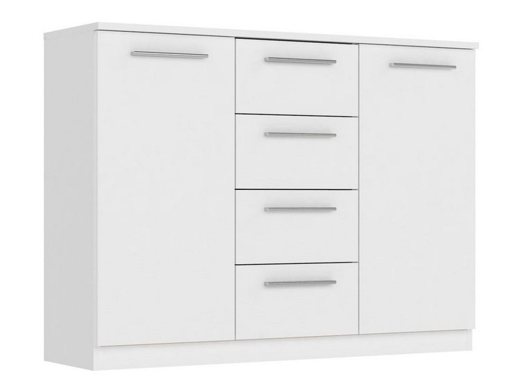 Dvoudveřová komoda se 4 zásuvkami v moderním provedení. Korpus i dvířka jsou z kvalitní LTD (18 mm) v barvě matná bílá. Lamino je odolné vůči vysokým teplotám a poškrábání. Dodáváme v demontovaném stavu.CASA 85011