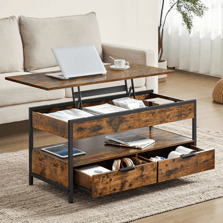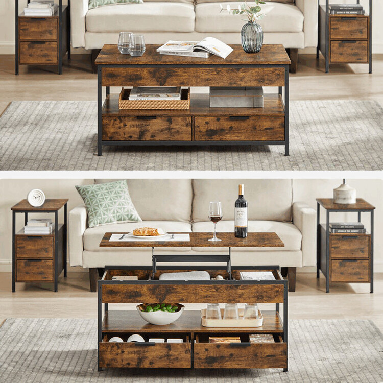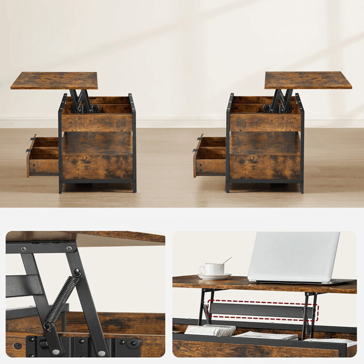Konferenční stolek AKF-E1252 OLW kombinuje praktický úložný prostor s industriálním designem v odstínu old wood. Deska stolu je vyrobena z MDF s povrchovou úpravou připomínající staré dřevo, která dodává stolku rustikální charakter a snadnou údržbu. Pevná kovová podnož zajišťuje stabilitu a dlouhou životnost, zatímco výklopná horní deska odhaluje prostorný úložný prostor vhodný pro uložení časopisů, dálkových ovladačů nebo jiných drobností. Dvě spodní zásuvky s kovovými úchytkami doplňují funkčnost stolku a umožňují organizaci menších předmětů. Rozměry 50×100×48–63 cm poskytují dostatek prostoru pro pohodlné použití v obývacím pokoji.