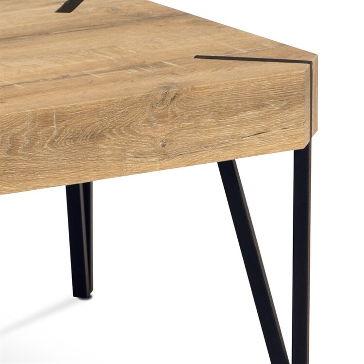 Konferenční stolek o rozměrech 110×60×42 cm kombinuje desku z MDF s běleným dubovým dekorem a pevné kovové nohy v matné černé barvě, které zajišťují stabilitu a dlouhou životnost. Deska s přírodním dubovým dekorem nabízí odolný povrch, který se snadno udržuje a je vhodný pro každodenní použití v moderních interiérech. Kovové nohy mají jednoduchý geometrický tvar, který podtrhuje industriální charakter stolku a zároveň poskytuje dostatečnou nosnost. Design spojuje přírodní vzhled dřeva s moderním kovovým prvkem, což umožňuje stolek snadno začlenit do různých stylů zařízení. Stolek je pevný a navržený tak, aby sloužil jako praktický doplněk obývacího pokoje nebo kanceláře.