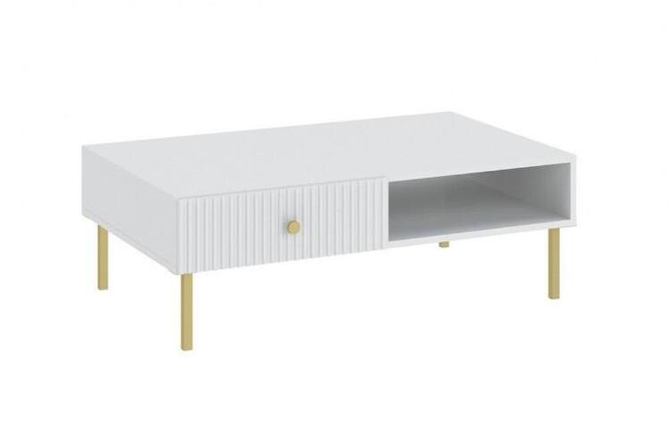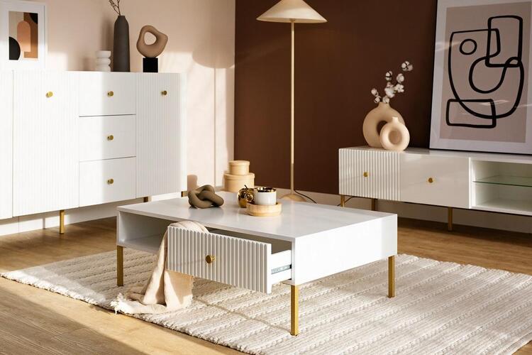 Konferenční stolek se dvěma zásuvkami v elegantním stylu, je vyroben z kvalitní LTD desky v barevném provedení bílá. Přední část nábytku je doplněna dekorem frézovaných dveří. Vysoké kovové nožky nábytku a úchyty jsou v barevném provedení zlatá. V naší nabídce naleznete více variant nábytku... více informací o zboží
