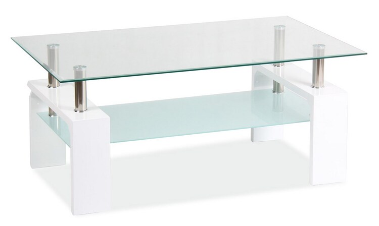 Stylový konferenční stolek v moderním provedení. Konstrukce MDF je v barvě bílý lak v kombinaci s pochromovaným kovem, vrchní deska ( 8 mm ) u stolu je z průhledného skla, odkládací polička je z mléčného skla. Sklo je tvrzené. Tento stolek lze objednat i v jiném provedení materiálu a barev.CASA 11449