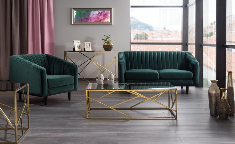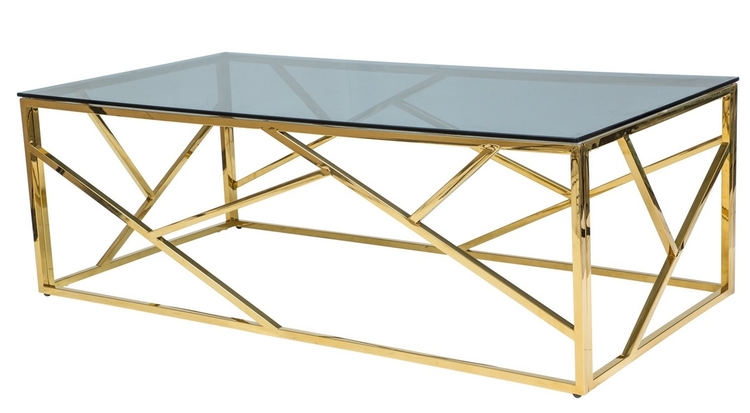 Konferenční stolek v moderním stylu glamour. Konstrukce je z kovu ve zlaté barvě, vrchní deska je z tvrzeného kouřového skla. Tento stylový kousek v netradičním designu se bude vyjímat v každém interiéru. Dodáváme v demontovaném stavu.CASA 11243