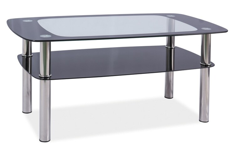 Elegantní konferenční stolek s moderním vzhledem. Kovová konstrukce je pochromovaná, vrchní deska je kombinací tvrzeného černého a čirého skla. Skleněná polička je černá.CASA 11665