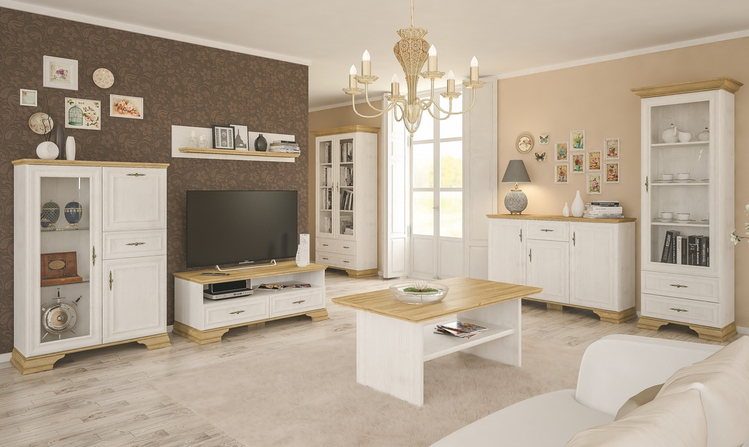 Konferenční stolek s odkládací policí ze sektorového nábytku v romantickém stylu. Nábytek je vyroben z kvalitní LTD v kombinaci s MDF v barvě borovice andersen. Dodáváme v demontovaném stavu.CASA 97011