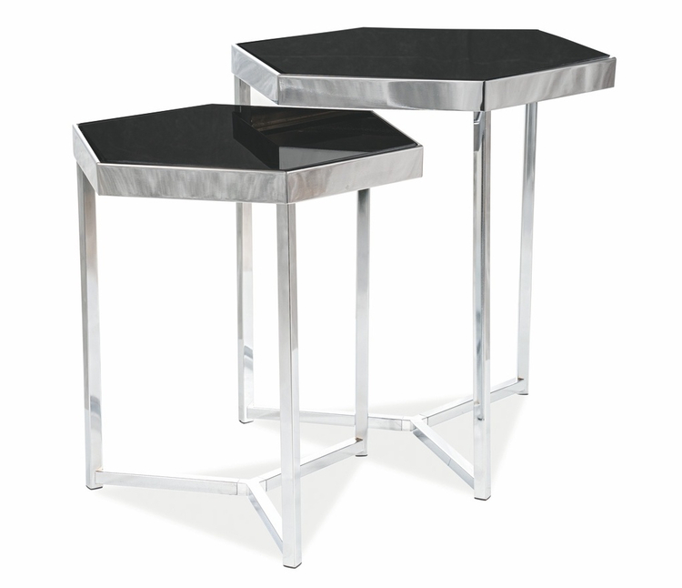 Sestava 2 kusů stolků v moderním stylu glamour. Konstrukce je z kovu v barvě chróm, deska stolku je z tvrzeného skla v černé barvě. Tento stylový kousek v moderním designu se bude vyjímat v každém interiéru. Dodáváme v demontovaném stavu.CASA 11031