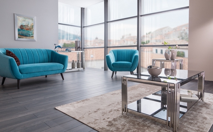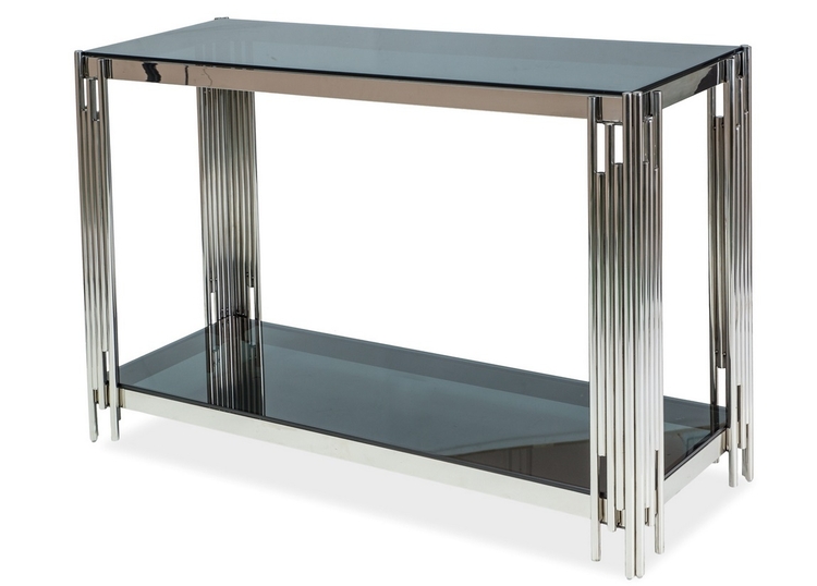 Konzolový stolek v moderním stylu glamour. Konstrukce je z kovu v barvě chróm, odkládací desky jsou z tvrzeného kouřového skla. Tento stylový kousek v netradičním designu se bude vyjímat v každém interiéru. Dodáváme v demontovaném stavu.CASA 11309