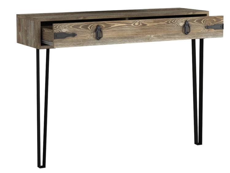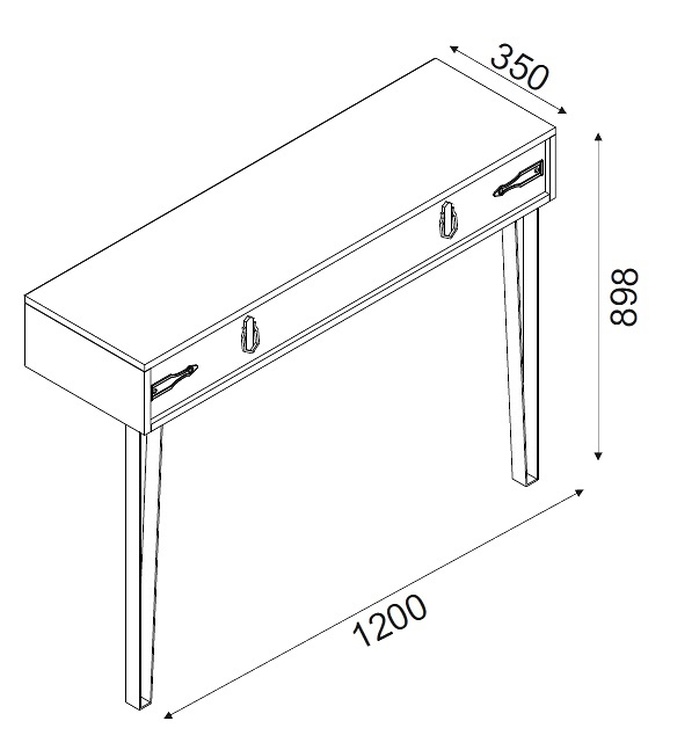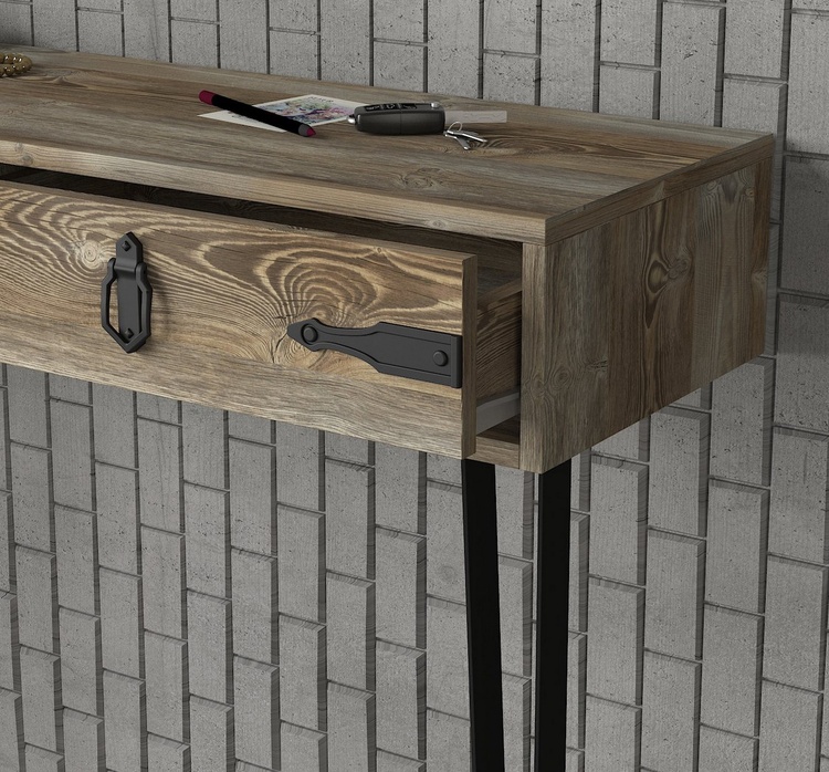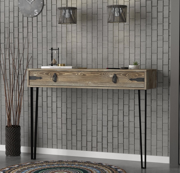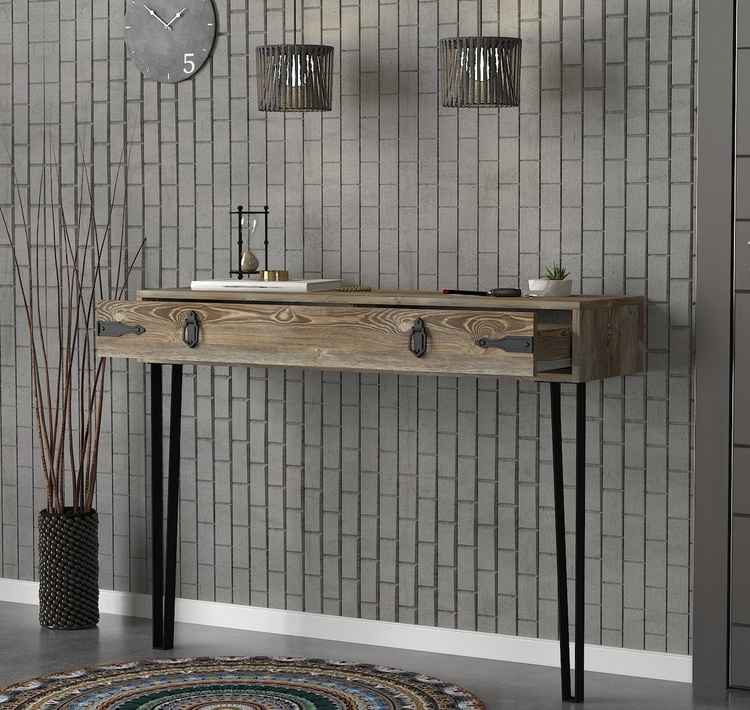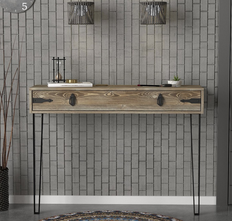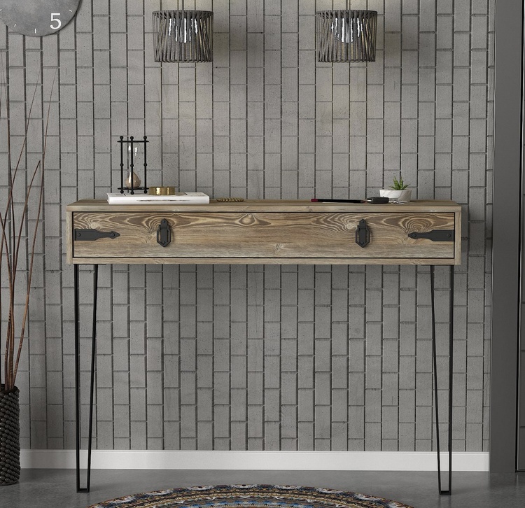 Konzolový – toaletní stolek se zásuvkou je vyroben z kvalitního lamina o tl.18 mm hraněné PVC páskou, odolného proti poškrábání v barvě patik. Lakované kovové nožky a úchyty jsou elegantně doplněny o kování, vše v barvě matná černá. Dodáváme v demontovaném stavu.CASA 28091