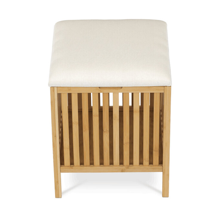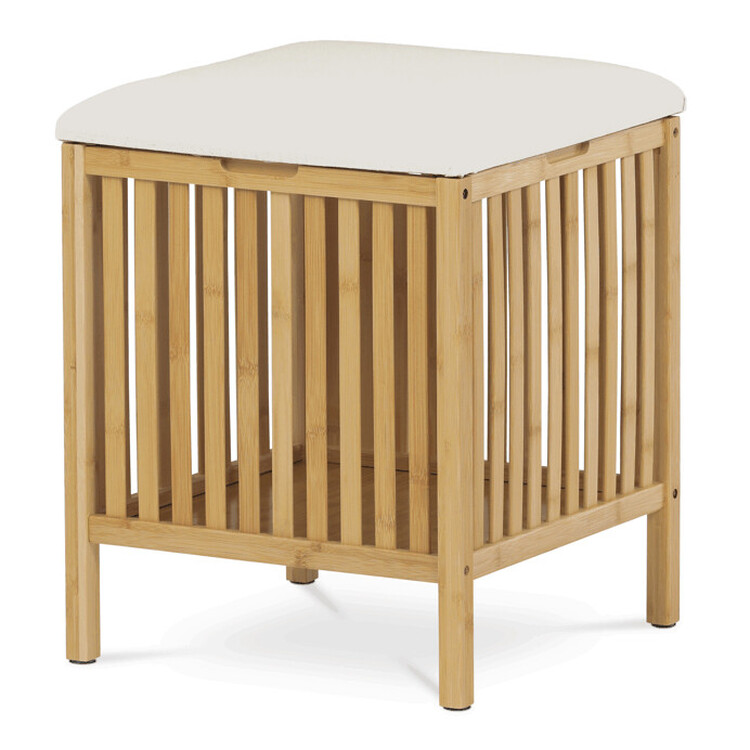 Koš na prádlo z masivního bambusu v přírodním odstínu kombinuje praktický úložný prostor s možností sezení díky polstrovanému sedáku v jemné bílé barvě. Bambusové lamely tvoří pevnou a vzdušnou základnu, která umožňuje cirkulaci vzduchu uvnitř koše. Polstrovaný sedák je potažený látkou, která se snadno udržuje a zvyšuje komfort při sezení. Díky svému přírodnímu vzhledu se hodí do různých interiérů, kde přináší přírodní atmosféru a funkčnost v jednom.