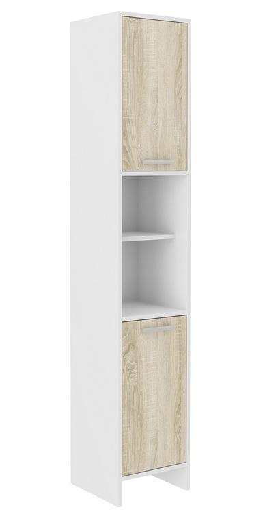 Sestava do koupelen, stylová a zároveň vhodná do moderních interiérů. Korpus i dvířka jsou vyrobeny z desky LTD 16 mm potažené PVC folií v barvě bílá/dvířka v dub sonoma. Zadní strana je ze sololitu. Úchyty jsou plastové. Skládá se (šxvxh) – 1-dveřová skříňka dolní se zásuvkou (34×86,3×32 cm),... více informací o zboží