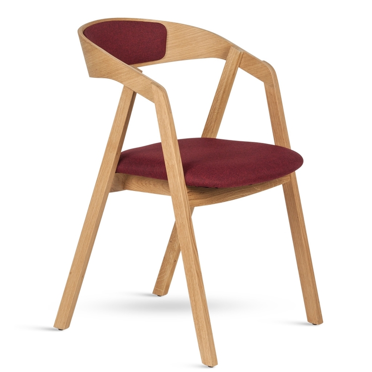 Jídelní židle s područkami. Dub masiv. Stohovatelná. Sedák i opěrka čalouněné.
