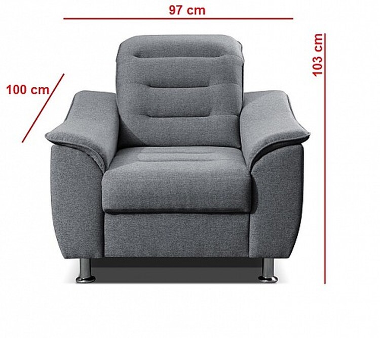 Přesné rozměry křesla BALBOA jsou takovéto: šířka 97, výška 93 až103 centimetry a délka přesně 1 metr. Má široké područky a měkképolstrování, stabilitu mu dodávají pevné chromované nožky.