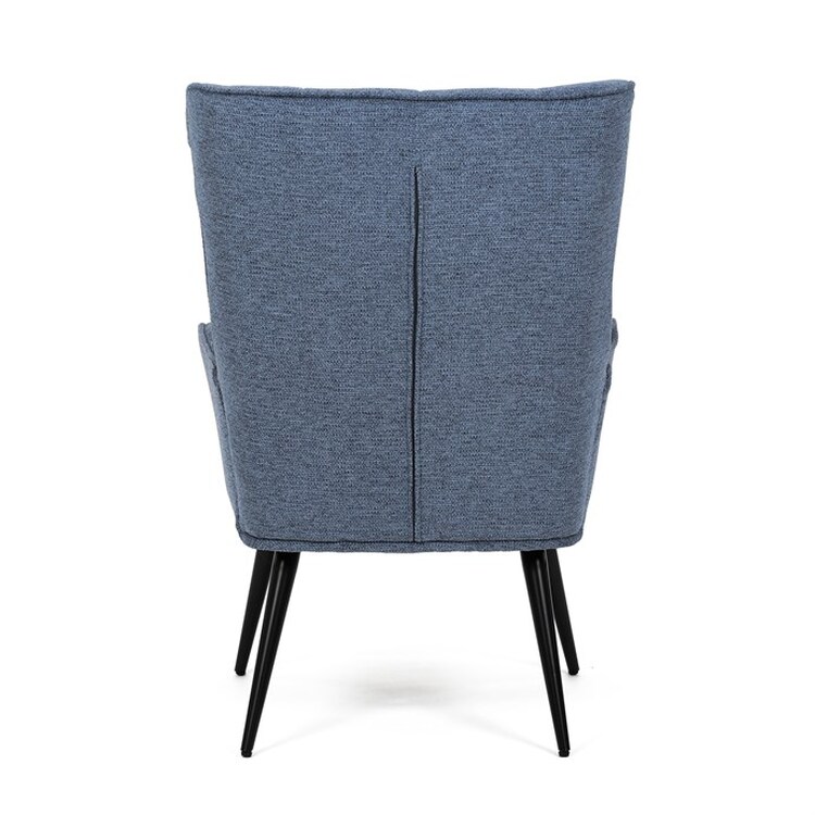 Křeslo s modrým potahem z voděodolné látky kombinuje pohodlí s praktickým využitím v interiéru. Pevná konstrukce nohou z kovu a masivního kaučukovníku zajišťuje stabilitu a dlouhou životnost. Opěradlo a sedák jsou vyplněné měkkou výplní a potažené látkou s designovým prošitím, které dodává křeslu moderní vzhled a zároveň podporuje komfort při sezení. Křeslo je vybaveno pevnými područi, které přispívají k ergonomii a pohodlí uživatele. Díky voděodolné úpravě potahu je snadné udržovat křeslo čisté a vhodné i do prostor s vyšší mírou vlhkosti.