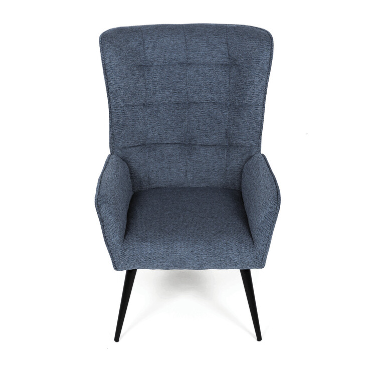 Křeslo s modrým potahem z voděodolné látky kombinuje pohodlí s praktickým využitím v interiéru.Kovové prvky zajišťují stabilitu a dlouhou životnost. Designové prošití na opěradle a sedáku podtrhuje moderní vzhled a zároveň přispívá k pevnosti čalounění. Područky jsou integrované do celkového tvaru křesla, což zvyšuje komfort při sezení. Díky použitým materiálům je křeslo vhodné pro každodenní relaxaci s důrazem na snadnou údržbu a odolnost vůči vlhkosti.
