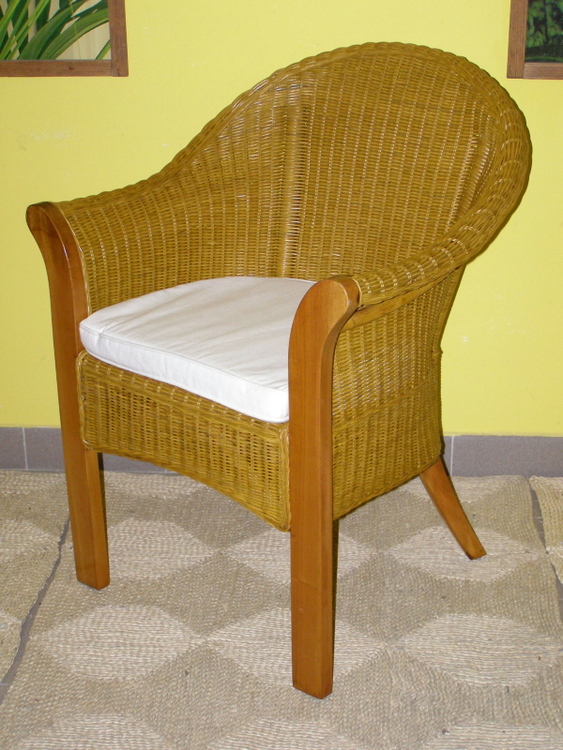 Křeslo s konstrukcí z mahagonového dřeva a výpletem z přírodního ratanu.