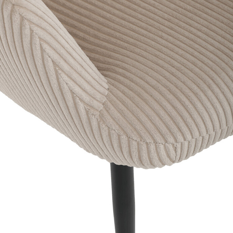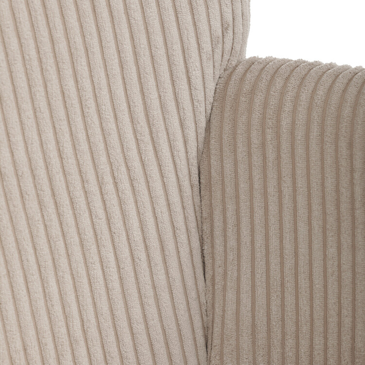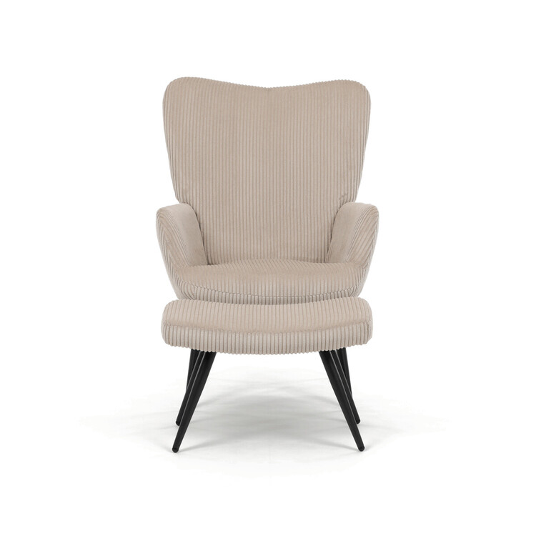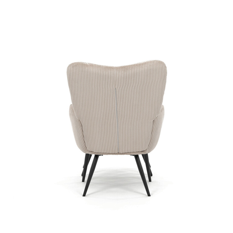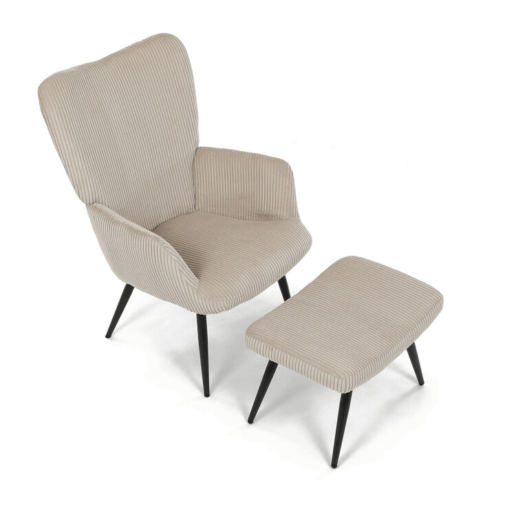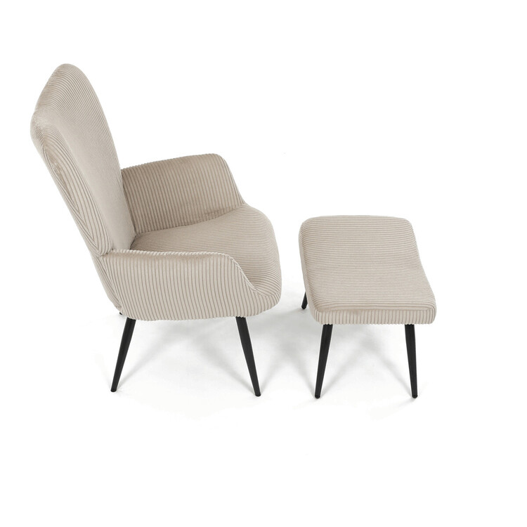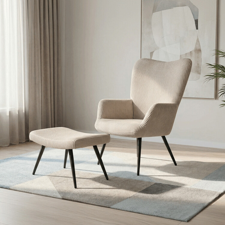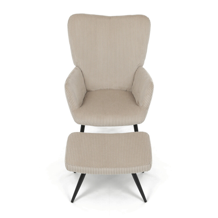 Relaxační křeslo s podnožkou v béžovém manšestru nabízí pohodlné posezení s dostatečnou oporou díky čalouněným područkám a vysokému opěradlu. Potah z manšestrové látky přináší příjemnou texturu a vizuální efekt, který podtrhuje útulný charakter křesla. Stabilní černé kovové nohy zajišťují pevnost a dlouhou životnost, přičemž taburet slouží jako praktický doplněk pro odpočinek nohou. Křeslo není otočné ani rozkládací, což podtrhuje jeho jednoduchost a funkčnost v interiéru. Díky svým rozměrům a designu je vhodné do obývacích pokojů i relaxačních zón.