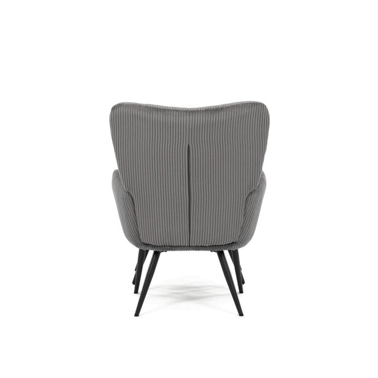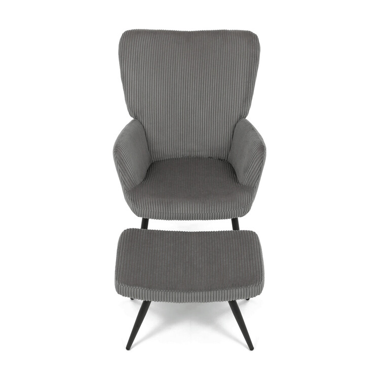 Relaxační křeslo s podnožkou v šedém manšestru nabízí pohodlí a styl v jednom. Potah z manšestrové látky je příjemný na dotek a zároveň snadno udržovatelný, zatímco černé kovové nohy zajišťují stabilitu a pevnost celé sestavy. Křeslo je vybaveno pevnými područkami, které podporují správnou ergonomii při sezení. Bonusový taburet umožňuje pohodlné opření nohou a přispívá k celkovému relaxačnímu zážitku. Díky svým rozměrům a designu se hodí do moderních i klasických interiérů.