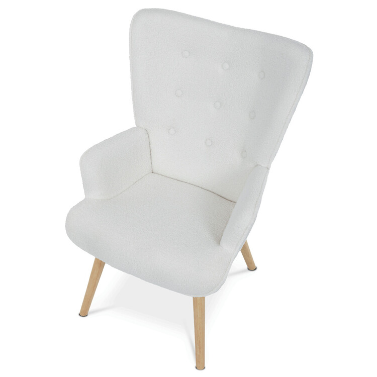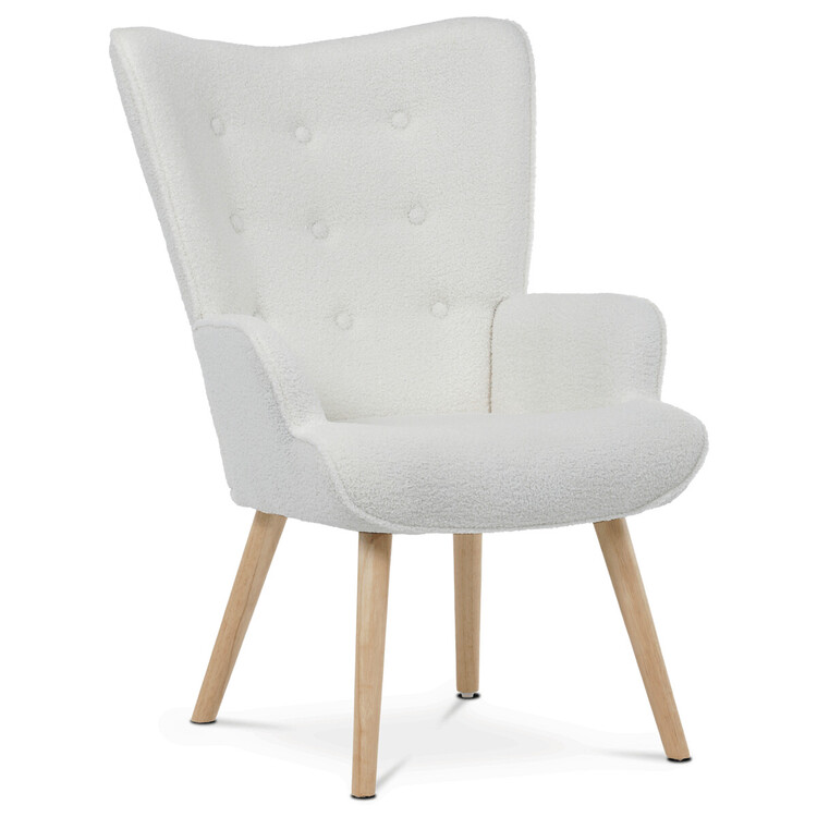 Elegance a pohodlí se setkaly v tomto skvělém křesle „ušák“. Jeho švédský styl přináší do Vašeho interiéru jedinečnou atmosféru.Zkrášlete svůj obývací pokoj nebo pracovnu tímto křeslem, které v sobě kombinuje bílou barvu a přírodní masivní nohy. Potah křesla je vyroben z látky bouclé s jemným povrchem. Pěnová výplň křesla Vám poskytne opravdový komfort.Kromě toho, že je toto křeslo stylové a moderní, nabízí také optimální rozměry. S kompaktní šířkou 68 cm, hloubkou 76 cm a výškou 101 cm je ideálním řešením pro menší místnosti, případně pokoje pro hosty.Nehledě na svoji lehkost je toto křeslo velmi odolné a použitelné i k relativně větší zátěži díky své nosnosti až 130 kg.