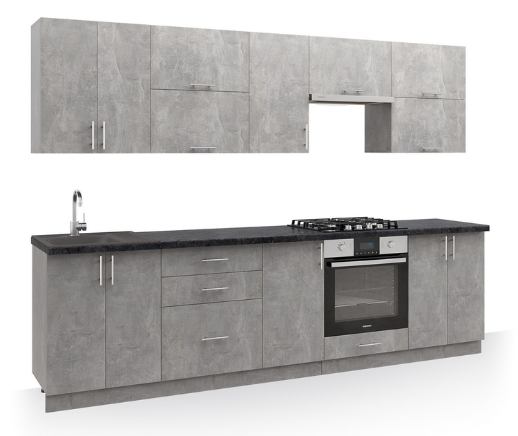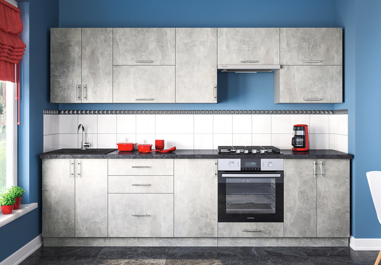 Tato moderní kuchyně kombinuje praktičnost a jednoduchý design. Skříňky se dají poskládat v libovolném pořadí a to Vám umožní si sestavit kuchyni podle svých představ. Korpus, sokl i dvířka jsou z kvalitní LTD desky v barvě beton. Úchyty jsou stříbrné plastové.Sestava se skládá ze spodních skříněk – výška 82 cm, hloubka 47 cm, (s pracovní deskou výška 85 cm, hloubka 60 cm), šířka: