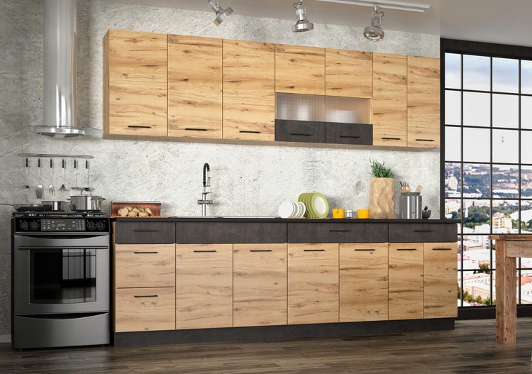 Kuchyně v moderním stylu. Tato kuchyně je navržena tak, že skříňky se dají poskládat v libovolném pořadí. To vám umožní si sestavit kuchyni podle svých představ. Korpus, sokl i dvířka jsou z kvalitní LTD desky v barevné kombinaci dub grenada/antracit. Úchyty jsou kovové.